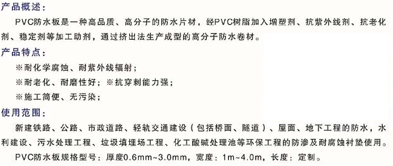 PVC防水卷材具有彈性好、延伸率高、收縮小、低溫柔性好、施工方便、耐老化、防水效果好等特點,作為防水材料可廣泛應該于各種屋面、地下、游泳池、水渠、隧道、水電、核電、煤礦、水庫、水壩和防水滲漏工程。適用于1-3級各種工業、民用的建筑物、構筑物屋面及地下室工程的防水,以及隧道、水庫、水池、堤壩、垃圾場等土木工程的防滲。