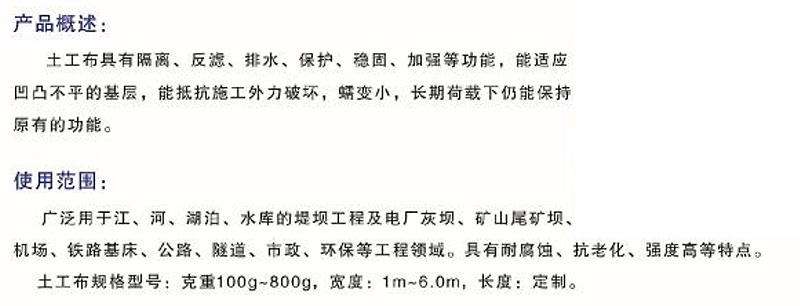 該產(chǎn)品具有優(yōu)良的過濾作用、排水作用、隔離作用、加筋作用、防護(hù)作用。可廣泛用于鐵路、公路、運(yùn)動(dòng)館、堤壩、水利建筑、隧道、沿海灘涂、圍懇、環(huán)保、電廠、機(jī)場(chǎng)等工程。